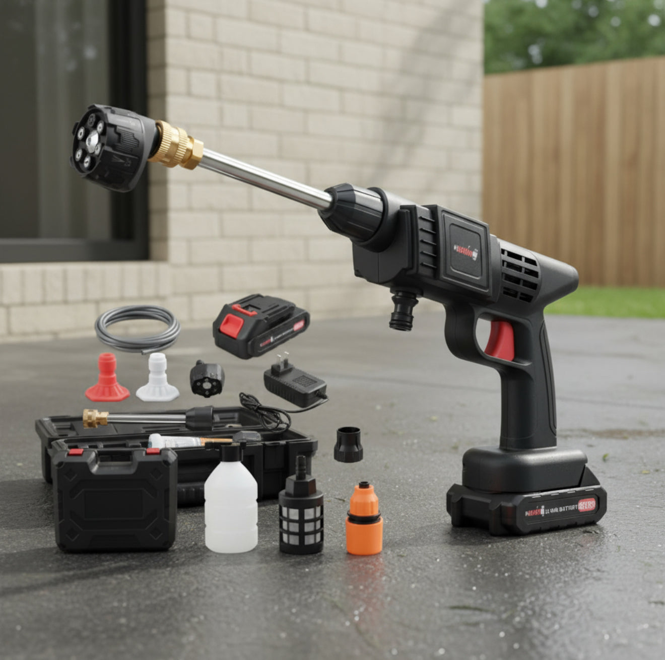PISTOLA DE LAVADO A PRESIÓN // DOS (2) BATERÍAS RECARGABLES // CARGADOR PARA BATERÍAS // MANGUERA DE SUCCIÓN O ENTRADA DE AGUA // ADAPTADOR RÁPIDO DE CONEXIÓN DE MANGUERA // BOQUILLA 6 CHORROS / 6 MODOS DE CHORRO // BOTELLA PARA ESPUMA / DETERGENTE // VARILLA DE EXTENSIÓN / LANZA // FILTRO DE AGUA // ESTUCHE O CAJA ORGANIZADORA PARA TRANSPORTE // MANUAL DE USUARIO