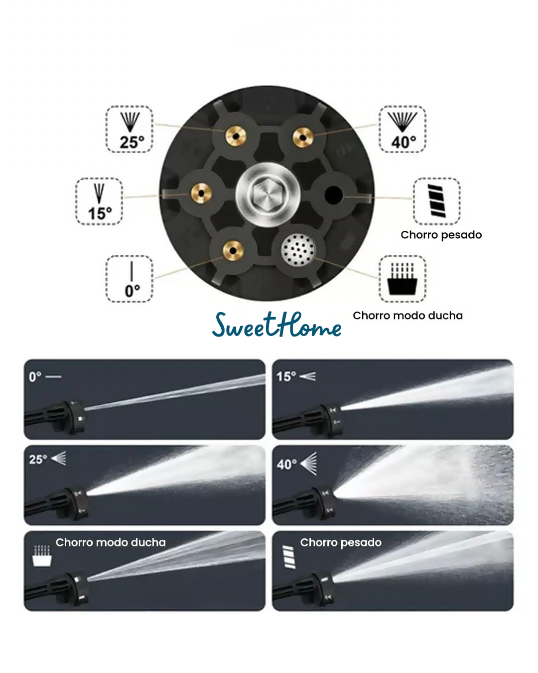 La nueva boquilla 6 en 1 🚀 transforma tu limpieza en una experiencia profesional 💪. Con sus 6 modos de chorro: 0° para máxima precisión 🎯, 15° y 25° para presión media potente 💦, 40° para un enjuague amplio 🌊, chorro pesado para la suciedad más difícil 🪣 y modo ducha para superficies delicadas 🛁, ¡adaptarte a cualquier tarea nunca fue tan fácil! ✨